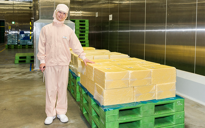現在製造しているマクドナルドのバーガー用のチーズは、オレンジ色をしたお馴染みのレギュラーチェダーチーズと、裏メニューでも登場するホワイトチェダーチーズの2種。原料となるのは、ニュージーランドやオーストラリア、アメリカや日本国内などで生産されたナチュラルチーズです。チーズのいい香りが漂う工場には、1つ20kgにもなる大きなチーズブロックがたくさん積まれています!