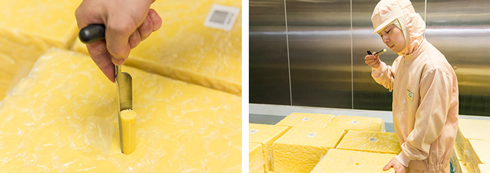 さっそくチーズの味わいチェック方法を見せてもらうことに。下村さんが取り出したのは、“チーズトライヤー”という長細いスコップのようなT字型の道具です。チーズトライヤーをチーズブロックの表面にグッと差し込み、クルリと回して引き抜くと、綺麗な円柱状のチーズが! 下村さんはまず引き抜いたチーズの香りを確かめ、指で潰して硬さをチェック。最後にそれを口の中へ入れます。キリッとしたその表情は真剣そのものです。