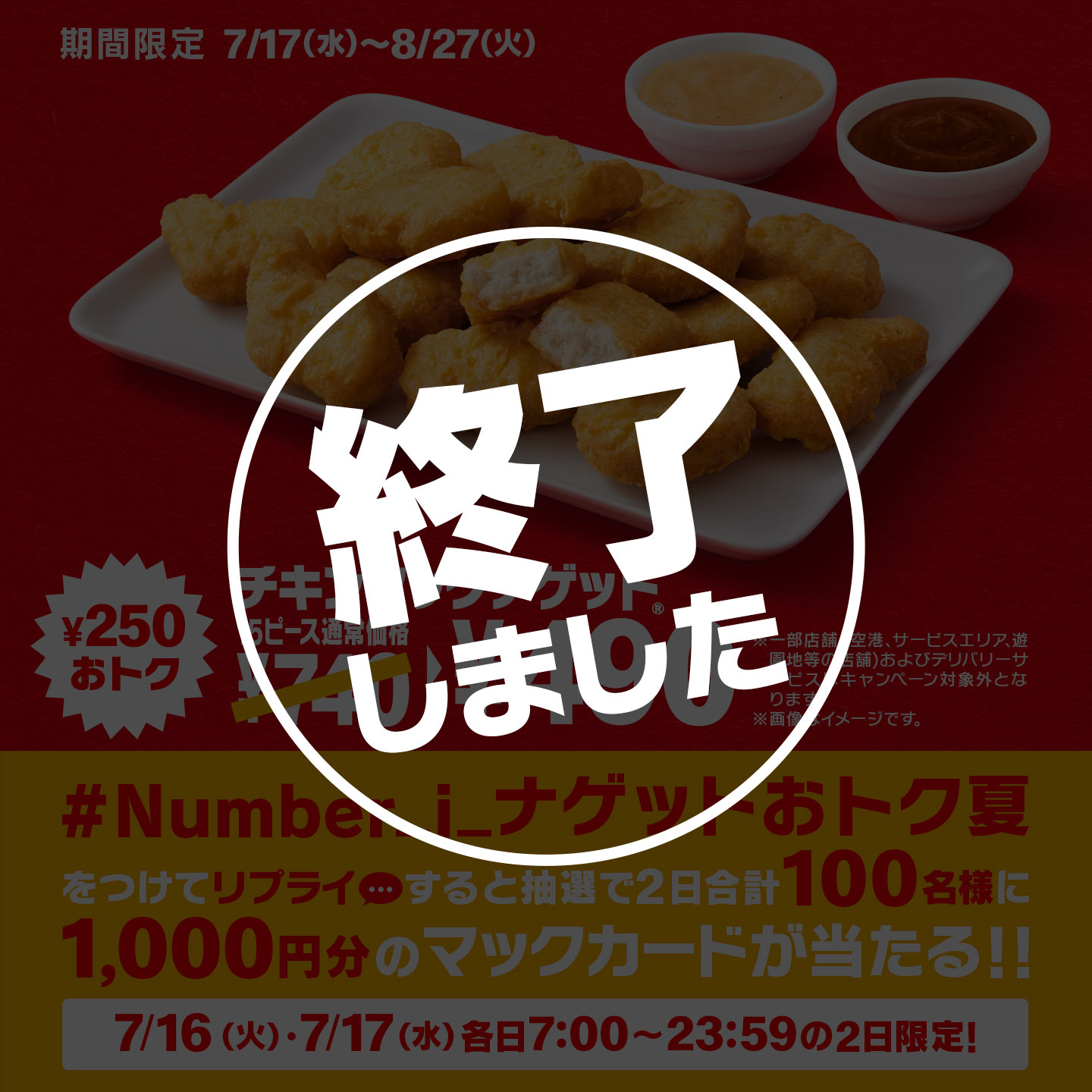 マクドナルド公式X(Twitter)アカウント(@McDonaldsJapan)をフォローし、同アカウントから投稿された以下に記載の各日指定のハッシュタグが付いたポスト(合計2投稿。以下「キャンペーン対象ポスト」といいます。)に以下記載の各日指定のハッシュタグを付けてリプライすると、抽選で2日合計100名様(各日50名様)に、1,000円分のマックカードが当たります。
