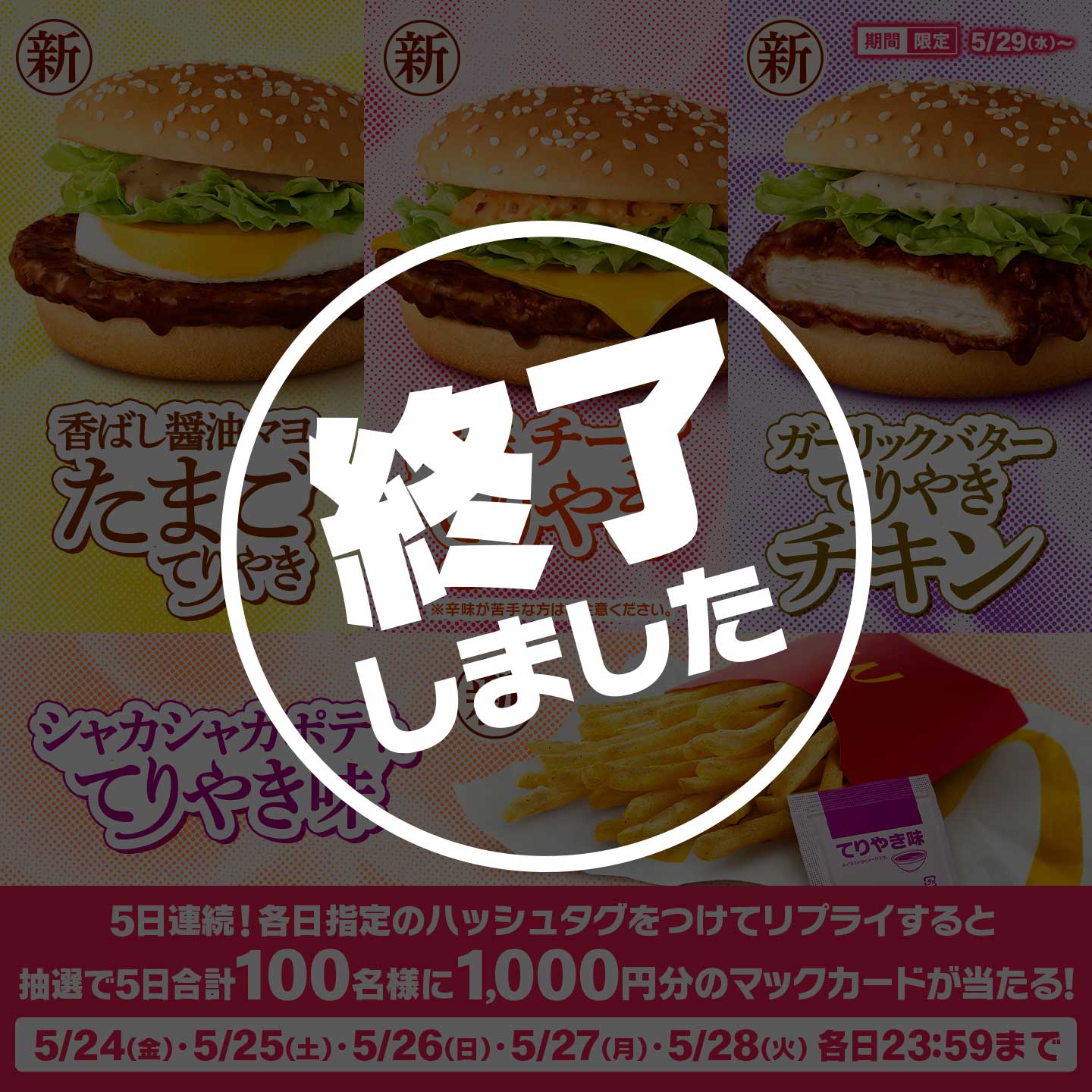 マクドナルド公式X(Twitter)アカウント(@McDonaldsJapan)をフォローし、同アカウントから投稿された「#ご当地てりやきJAPANまもなく集結」のハッシュタグが付いたポスト(以下「キャンペーン対象ポスト」といいます。)「#ご当地てりやきJAPANまもなく集結」のハッシュタグを付けてリプライすると、抽選で100名様に、1,000円分のマックカードが当たります。