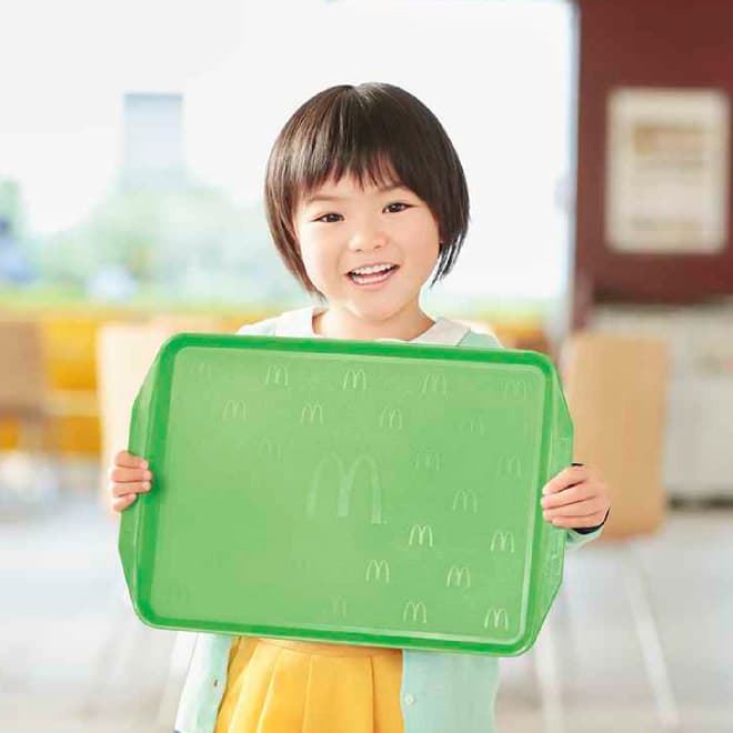 現在、日本マクドナルドでは年間約1億食のハッピーセットを販売しています。ハッピーセットに付いてくるおもちゃはお子様に喜んでいただける半面、遊び終えた後は各ご家庭で処分していただくしかありませんでした。そこで、持続可能な社会の実現に貢献するためにおもちゃ回収ボックスを設置し、お店で使うトレイなどにリサイクルする「おもちゃリサイクル」をスタート。リサイクルした目印である緑色のトレイを発見することでリサイクルの流れが体感しやすくなり、親子で環境について話し合うきっかけとしてもお役立ていただいています。また、子どもたちが気軽に参加できてリサイクルを学べるこの「おもちゃリサイクル」は、“持続可能な開発のための教育(ESD)”としての役割も担っています。2019年に回収したおもちゃの数は約340万個にものぼりました。おもちゃとお別れするときや、店内で緑色のトレイを見つけたとき。お子様にそっと教えてあげてください。「遊び終わったおもちゃは生まれ変わって、またみんなを喜ばせてくれるんだよ」と。