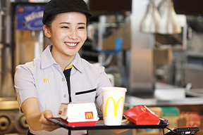 マクドナルドは子供たちが選ぶ「連れていってほしいお店」のNo.1(マクドナルドによる市場調査)。その理由は、ハンバーガーの人気に加え、優しく応対してくれるクルーのお姉さんやお店の雰囲気にあるといわれています。真心のこもったサービスを実践し、お客様に心地よい空間をご提供することで、"FUN PLACE TO GO" 「マクドナルドに行けば何か楽しいことがある」と感じていただける、そんなお店づくりを行っています。