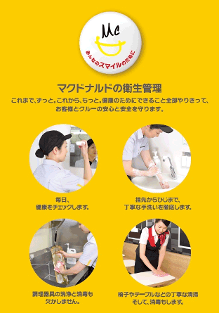 弊社では、お客様に安心してマクドナルドをご利用いただけますよう、全国約1100店舗に設置されているデジタルコミュニティボード(デジタル掲示板)を活用して、「従業員の健康チェックや手洗いの徹底」「調理機具の洗浄と消毒・メンテナンス」「客席の清掃・消毒」など、マクドナルドが常日頃から実行している衛生管理の取り組みを分かりやすくお伝えします。