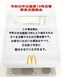 日本マクドナルド株式会社(本社:東京都新宿区、代表取締役社長兼CEO:日色 保)は、このたびの台風19号により被災された方々を支援するため、全国のマクドナルド店舗において、10月16日(水)から10月31日(木)までの期間、緊急支援店頭募金活動を実施いたします。お預かりした募金は全額、日本赤十字社にお渡しいたします。