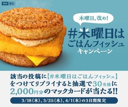 @McDonaldsJapanが投稿する、キャンペーン対象ツイートに、「#米曜日はごはんフィッシュ」を付けてリプライする。