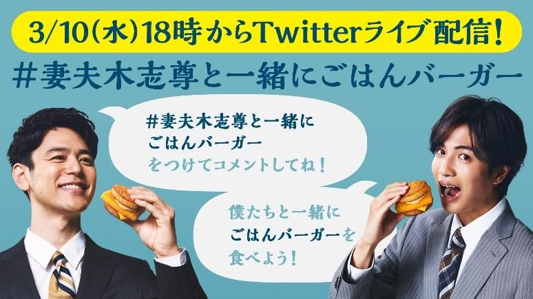 ごはんバーガーとして初めてお魚を使用した商品「ごはんフィッシュ 和風黒胡椒」の発売を記念し、マクドナルド公式TwitterでのLIVE配信企画『妻夫木&志尊と一緒に「ごはんバーガー」いただきます!』を、発売日である2021年3月10日(水)18時より開催します。