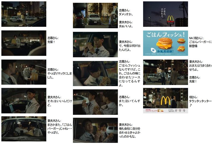 TVCMでは、1月に続き妻夫木聡さんと志尊淳さんのご出演による「ごはんバーガー」シリーズの第2弾をオンエアします。先輩後輩の間柄の妻夫木さんと志尊さんが、仕事の合間に「ごはんバーガー」を食べながら交わすコミカルな会話を通じ、「ごはんフィッシュ 和風黒胡椒」の魅力を伝えます。また、ナイツの塙宣之さんにも引き続きご出演いただきます。さらに、3月10日(水)の発売当日には、妻夫木さん・志尊さんによるマクドナルド公式TwitterでのLIVE配信企画の実施も決定。Twitterキャンペーンなどとあわせてぜひお楽しみください。(詳細は下記を参照)