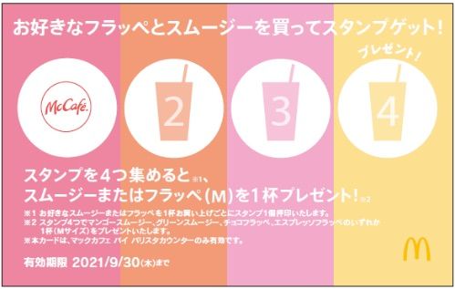 期間限定商品を含むスムージーまたはフラッペを1杯ご購入ごとに、1スタンプがたまるスタンプカードを各店舗にて数量限定でお配りします。スタンプを4つ集めると、レギュラーメニューのスムージー(マンゴースムージーもしくはグリーンスムージー)またはフラッペ(チョコフラッペもしくはエスプレッソフラッペ)のMサイズを1杯無料でプレゼントいたします。