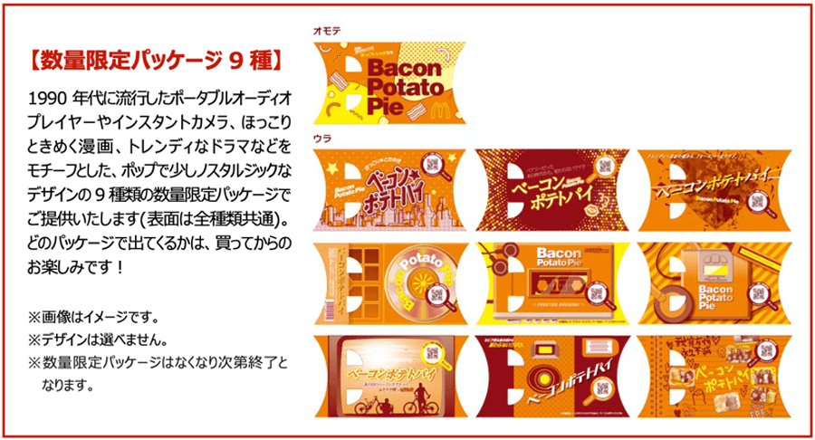 今年は「ベーコンポテトパイ」をお召し上がりいただきながら、同商品が初登場した1990年代を思い出し、ほっこりと懐かしい気持ちになっていただきたいという想いを込めて、1990年代に若者の間で流行したポータブルオーディオプレイヤーやインスタントカメラ、ほっこりときめく漫画、トレンディなドラマなどをモチーフとした、ポップで少しノスタルジックなデザインの9種類の数量限定パッケージでご提供いたします。また、テレビCMでは、1990年代のヒット曲である奥田民生さんの「イージュー★ライダー」に乗せて、何とも言えない懐かしさとともに、思わずエモーショナルな気持ちがかきたてられるような世界観を表現しました。