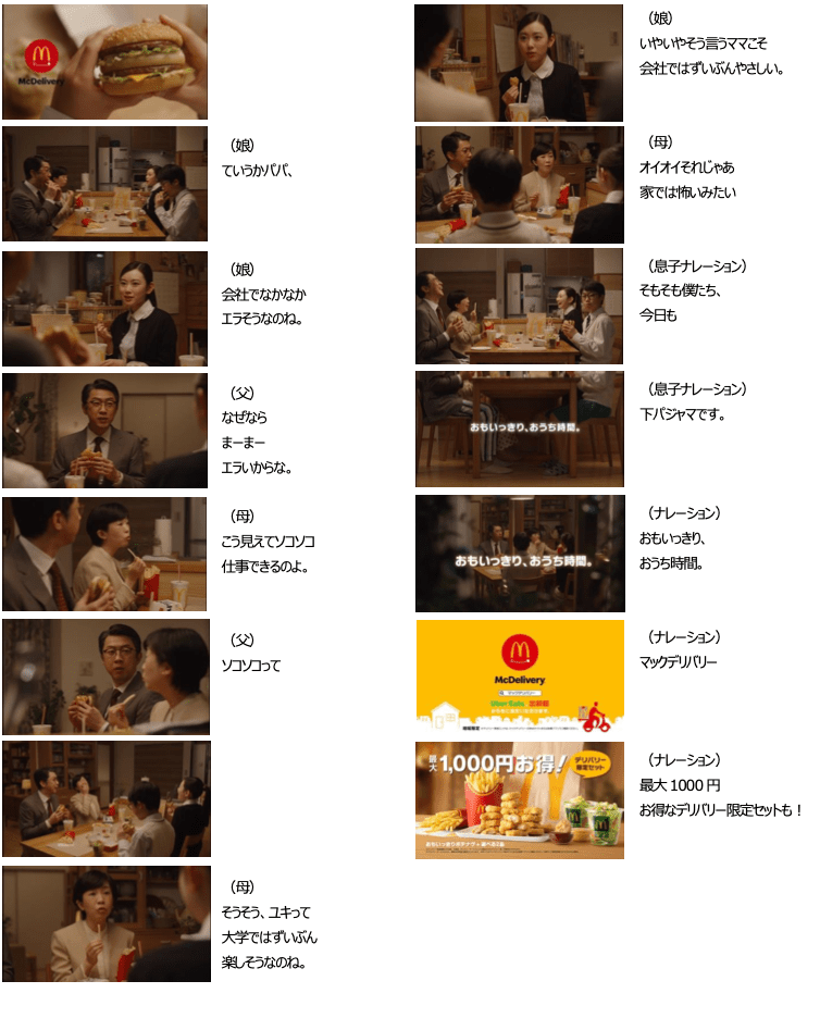 また、今回のTVCMでは「おもいっきり、おうち時間」をコンセプトに、家族の会話から生まれる「おうち時間あるある」とあわせて、その食事シーンを彩るマックデリバリーを楽しく訴求しています。