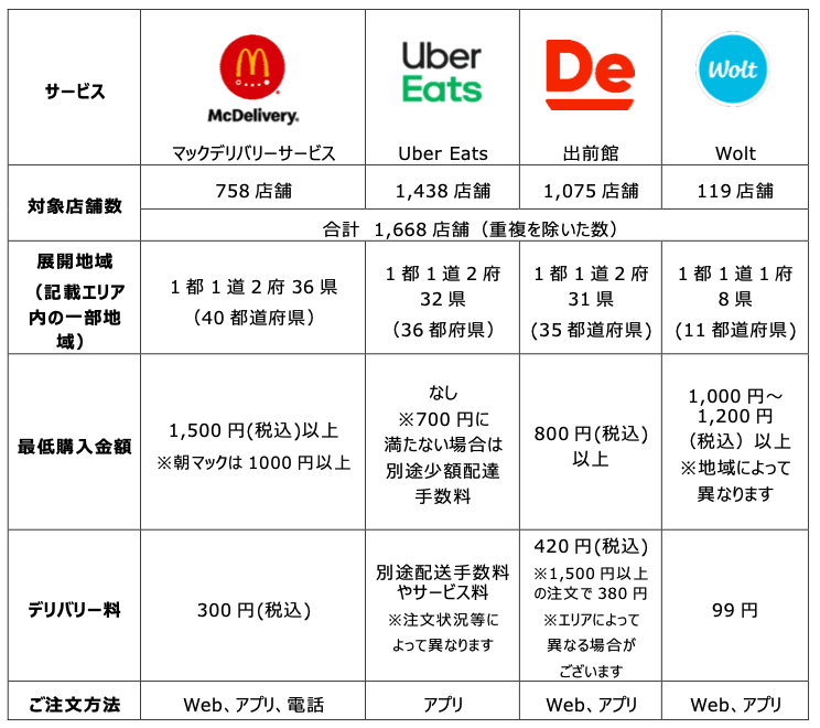 「マックデリバリー」は、以下の4つのサービスからご利用いただけます。