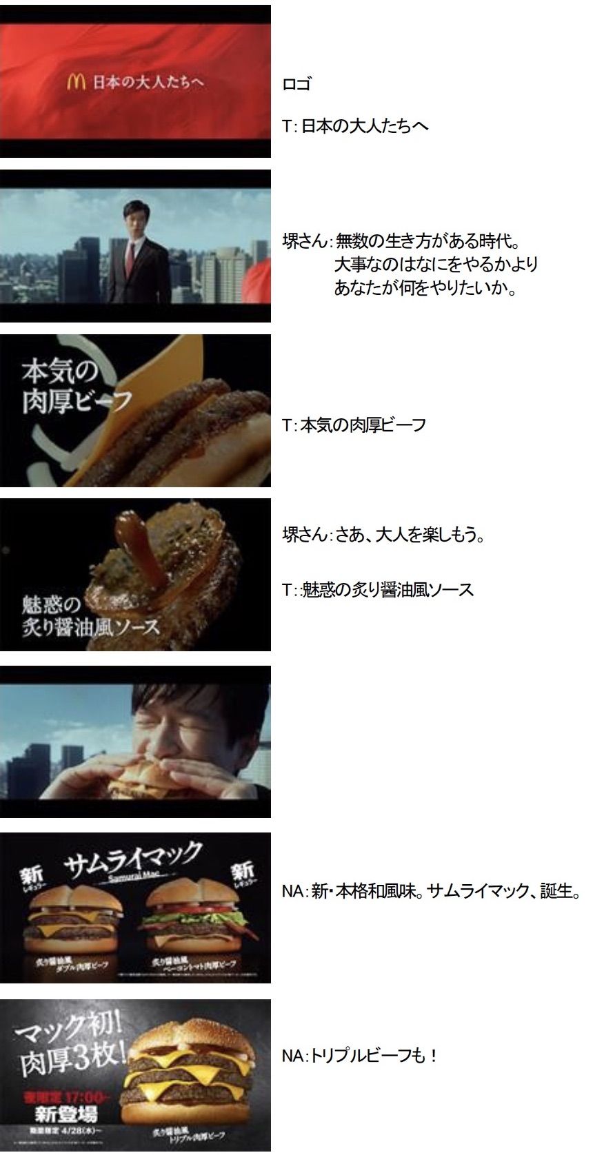 また、俳優の堺雅人さんを起用している『サムライマック』のTVCMシリーズでは、「大人を楽しめ」篇 トリプルビーフを4月27日(火)からオンエアいたします。日々がんばる大人の皆さまへエールを送るとともに、「炙り醤油風 トリプル肉厚ビーフ」の登場と商品の魅力をお伝えします。