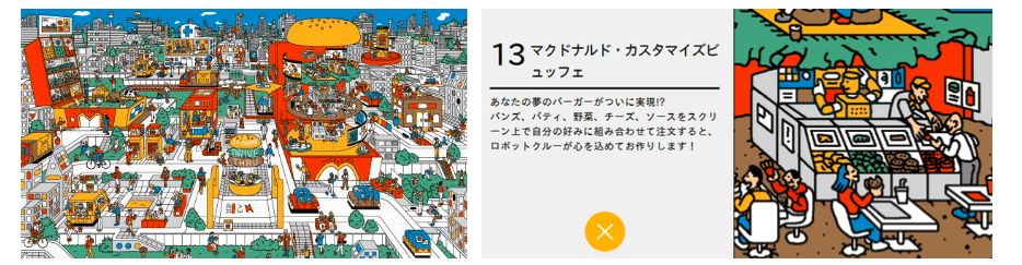 「マクドナルド未来予想図」は、今年の2月、公式Twitterアカウントを通して皆さまよりお寄せいただいた、未来のマクドナルドに関するアイデアを参考に、未来予想図としてイラストにしたものです。皆さまからいただいた「赤ちゃんからお年寄りまでみんなが集まって楽しめるお店」「バーガーを自分でカスタマイズできる」「ビュッフェがあったらうれしい」「ドローンでのデリバリー」「飲むバーガー・飲むポテト」等々、FUNにあふれる未来へのアイデアがたくさん詰まったイラストになりました。
