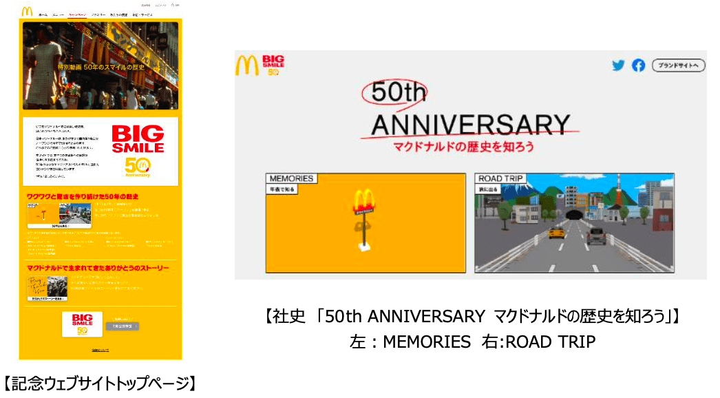2021年1月から、50周年を記念した特設ウェブサイトを公開しています。オープン時にはコンテンツ第一弾として「社史」を公開しました。年表「MEMORIES」にはマクドナルドクイズが隠れていたりと、FUNあふれるコンテンツとなっています。また、マクドナルドの歴史をゲーム感覚でドライブしながら楽しめる「ROAD TRIP」では、1971年から2021年まで各時代のゲームのような世界感だけでなく、実際のマクドナルドの店舗も再現されているなど、その時代の景色もお楽しみいただけます。次々出てくる建物や看板をタップやクリックすることで、日本マクドナルドの歴史の詳細を知ることができます。その他にもマクドナルドのこれまでの軌跡を「Mから生まれた50のハッピー」として紹介するコンテンツや、日本の社会とマクドナルドの歴史を照らし合わせた読み物コンテンツ、定番メニューのトリビアなども盛りだくさんです。今回はコンテンツ第二弾として、「マクドナルド未来予想図」、「Big Thank You」、「日本限定バーガー運命の誕生」を追加公開しています。今後も他のコンテンツ含め順次アップデートを予定しておりますので、ぜひ、ご期待ください。