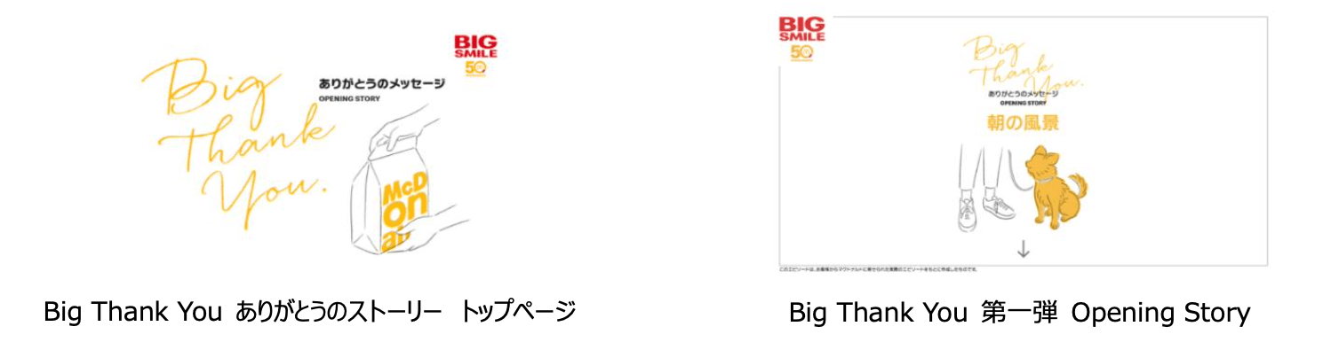 「Big Thank You」は、店舗で長年活躍している永年勤続クルーの方に共に働く仲間のクルーたちからの「ありがとう-Big Thank You!」を。また、いつもご愛顧いただいているお客様、長きにわたりマクドナルドを支えくださっているサプライヤーや地域の皆さまとマクドナルドとの間に生まれたさまざまな心温まる「ありがとうのストーリー」をお届けしていくコンテンツです。4月28日(水)公開の第一弾のOpening Storyでは、実際にお客様とクルーとの間で生まれた「ありがとうのストーリー」を物語風にご紹介します。2021年を通じて毎月素敵な「ありがとう」をご紹介していく予定ですので、ぜひお楽しみください。