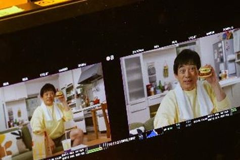 できたての「黒胡椒てりやき」がスタジオに運ばれてくると、華丸さんは「ベーコンがすごいですね~」とインパクトのあるビジュアルに興味津々。バンズやパティをしげしげと眺めながら、おいしそうに見える持ち方を研究し、食べる練習を繰り返し行いました。食べるシーンでは2台のカメラを一斉に回し、緊張が解けたタイミングで思い切りガブリ!見事な食べっぷりを絶賛した監督が「念のためもう1回。次はボケてください」とリクエストすると、華丸さんはさらに豪快な演技で応えました。