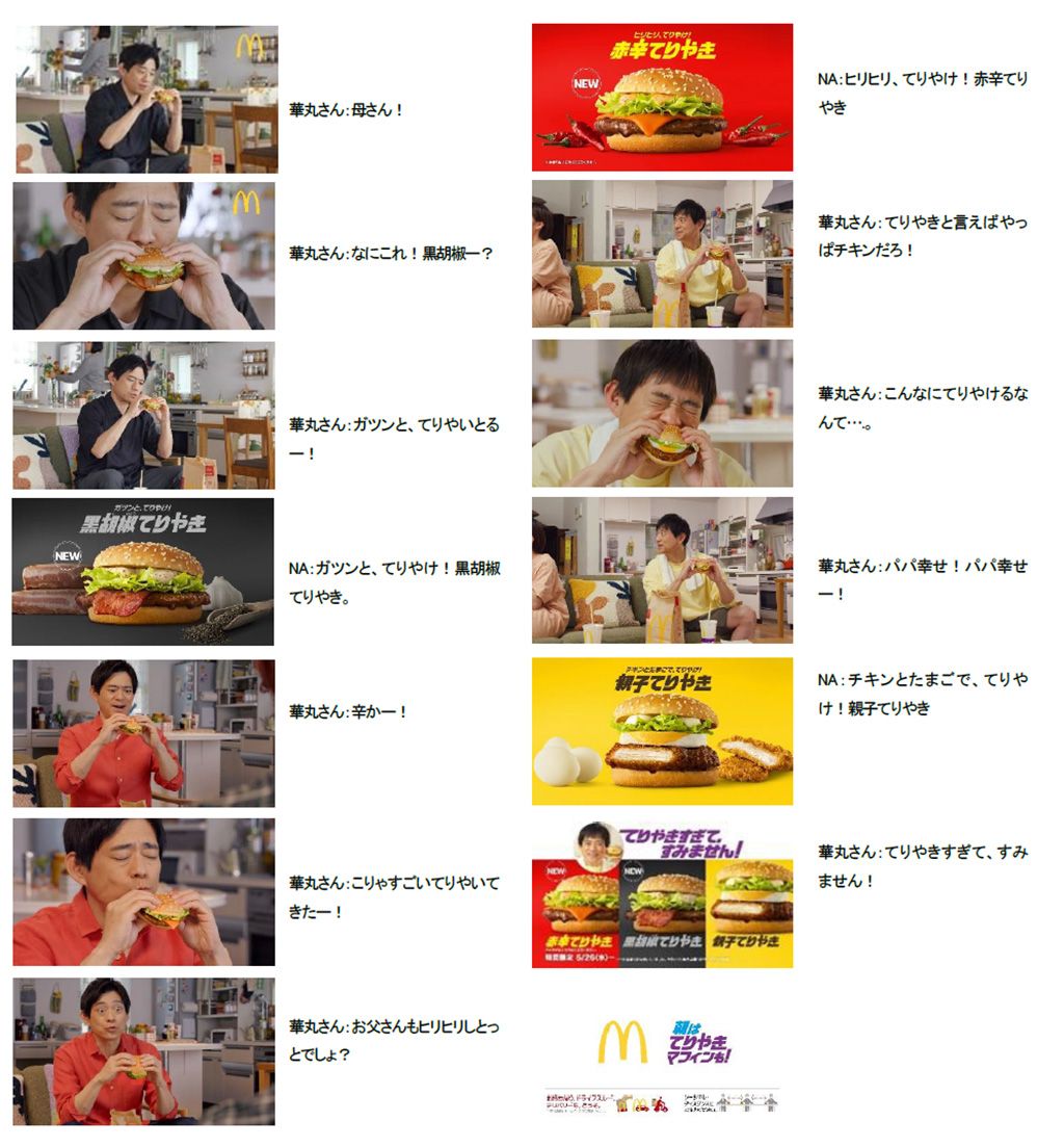 また、今回のてりやきシリーズの販売に合わせて、博多華丸さんが父親役となり3種のバーガーを堪能する姿を描いた新TVCMを5月25日(火)からオンエアします。また、Twitterキャンペーンなど各種の施策もあわせてお楽しみください。(詳細は下記を参照)