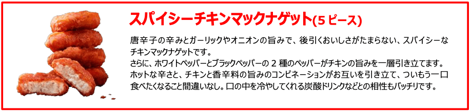 「スパイシーチキンマックナゲット」 「チキンマックナゲット」を ご購入いただくことで お楽しみいただけます。(※5) |