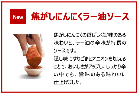 「焦がしにんにくラー油ソース」は、焦がしにんにくの香ばしく旨味のある味わいと、ラー油の辛味が特長のソースです。隠し味にすりごまとオニオンを加えることで、おいしさがアップし、しっかり辛い中でも、旨味のある味わいに仕上げました。