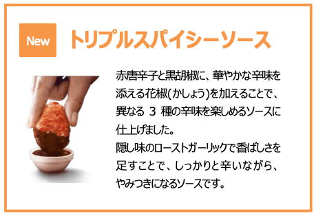 「トリプルスパイシーソース」は、赤唐辛子と黒胡椒に、華やかな辛味を添える花椒(かしょう)を加えることで、異なる3種の辛味を楽しめるソースに仕上げました。