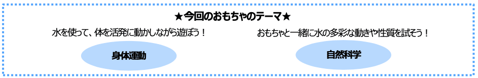 水鉄砲は、夏の外遊びのおもちゃの定番です。かけっこの「ようい、ドン!」のスターターピストルのように、「さあ、遊ぼう!」と仲間に水を向けて誘う道具でもあります。ユニバーサル・スタジオ・ジャパンのスターをかたどった水鉄砲のおもちゃは、相手をびっくりさせる所から水が飛び出します。水の出方に驚いた後、「どんな仕掛けかな?」とおもちゃのメカニズムが話題になるでしょう。活発な外遊びの時も、お風呂で家族とくつろぐ時も、水の物理的な性質を試しながら、遊びのコミュニケーションを楽しみましょう。