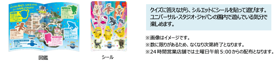 7月10日(土)・11日(日)の2日間は、ハッピーセット「ユニバーサル・スタジオ・ジャパン オールスターズ」を1セットご購入につき「ユニバーサル・スタジオ・ジャパン オールスターズ クイズ&シール図鑑」をプレゼントいたします。