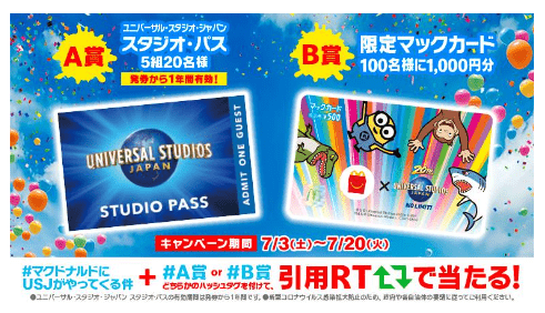 日本マクドナルドが50周年、ユニバーサル・スタジオ・ジャパンが20周年というダブル周年を記念して、ユニバーサル・スタジオ・ジャパンのスタジオ・パス(入場券)や、限定デザインのマックカードが当たるプレゼントキャンペーンを実施いたします。