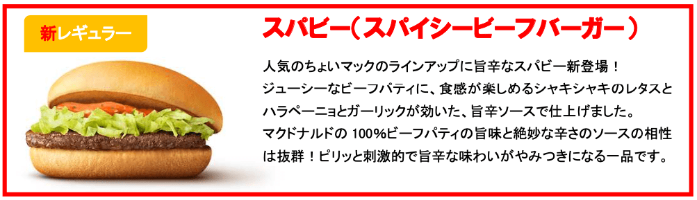日本マクドナルド株式会社(本社:東京新宿区、代表取締役社長兼CEO:日色 保)は、マクドナルドのバリューラインアップの象徴でもある、『ちょいマック』の200円バーガーの新商品「スパビー(スパイシービーフバーガー)」を新レギュラー商品として、2021年7月7日(水)より全国のマクドナルド店舗にて販売いたします。