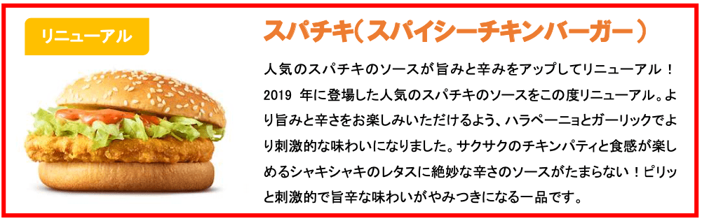 また、「スパビー」の登場と合わせて、2019年10月の発売以降、大変ご好評いただいております、「スパチキ(スパイシーチキンバーガー)」もさらに“旨辛”にパワーアップし、リニューアルいたします。