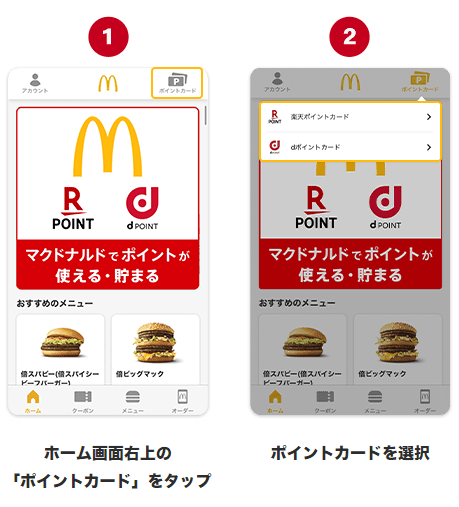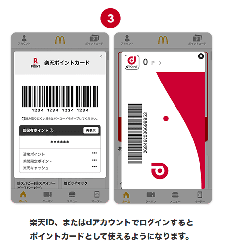 マクドナルド公式アプリで楽天ID、またはdアカウントでログインすることでポイントカードとしての利用やマクドナルドのクーポンとの併用も可能となります。