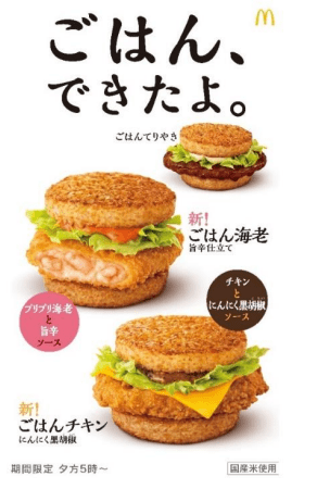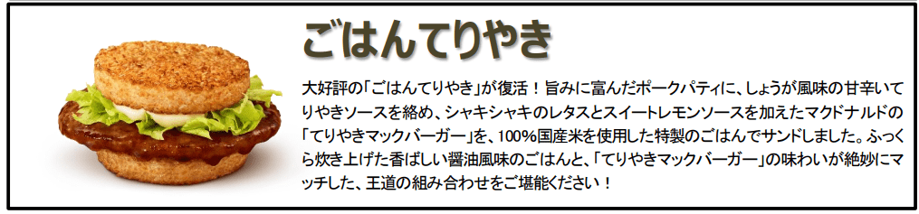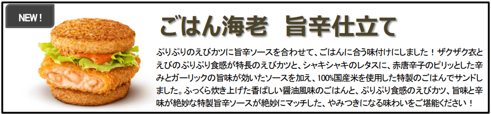 2つの新商品「ごはんチキン にんにく黒胡椒」と「ごはん海老 旨辛仕立て」は、特製のごはんバンズに合うような具材と味付けで開発をしております。「ごはんチキン にんにく黒胡椒」は、食べ応えのあるチキンパティににんにくの旨味と黒胡椒がガツンと効いたにんにく黒胡椒ソースを合わせ、「ごはん海老 旨辛仕立て」は、ぷりぷり食感のえびカツに赤唐辛子のピリッとした辛みとガーリックの旨味が効いたソースを合わせました。特に「ごはん海老 旨辛仕立て」は、Twitter上でお客様からのご要望が最も多かった、ごはんバーガー初のえびカツを使用した商品です。また、登場のたびにご好評いただいている「ごはんてりやき」は、旨みたっぷりのポークパティにてりやきソースを絡め、「てりやきマックバーガー」の味わいが楽しめる王道の組み合わせをご堪能いただけます。