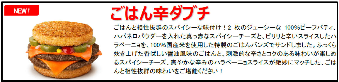 新商品「ごはん辛ダブチ」は、昨年ご好評いただいた「辛ダブチ」の刺激的な辛さと濃厚でコクのある旨みをごはんバンズがやさしく包み込んでおり、「辛ダブチ」とは違ったおいしさをお楽しみいただける商品です。ハバネロパウダーを入れた真っ赤なスパイシーチーズ、さらにピリリと辛いハラペーニョを加えたスパイシーな味付けで、2枚のジューシーな100%ビーフパティ、香ばしい醤油風味のごはんバンズとの相性が抜群です。