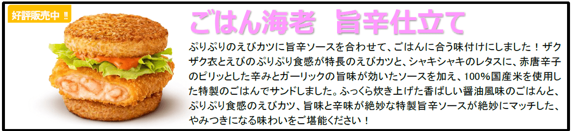 現在販売中の「ごはんチキン にんにく黒胡椒」と「ごはん海老 旨辛仕立て」は、発売以降想定を上回るご好評をいただいております。「ごはんチキン にんにく黒胡椒」は、サクサクとした軽やかな衣のチキンパティに、にんにくの旨味と黒胡椒がガツンと効いたにんにく黒胡椒ソースを合わせました。「ごはん海老 旨辛仕立て」は、Twitter上でお客様からのご要望が最も多かった、ごはんバーガー初のえびカツを使用した商品で、ぷりぷりの食感が楽しめるえびカツに赤唐辛子のピリッとした辛みとガーリックの旨味が効いた特製旨辛ソースを合わせました。