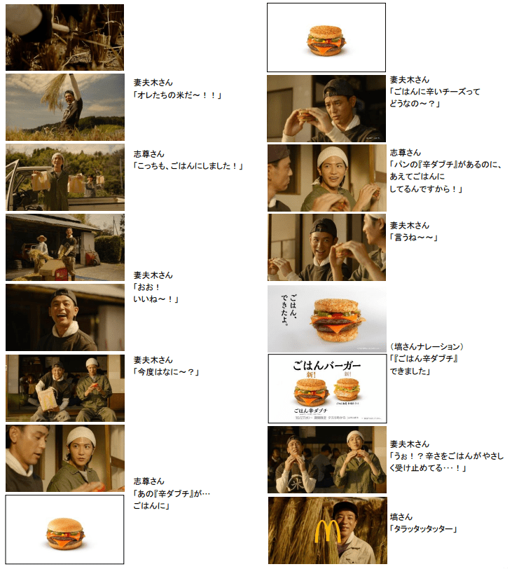 妻夫木聡さんと志尊淳さんが出演する「ごはんバーガー」のTVCMは、シリーズ最新作となる「農家でごはん/第2話」篇を10月26日(火)から放映します。農業を志して都会から移住し、“お米への愛”たっぷりに稲作を続ける妻夫木さんと志尊さんが、「ごはん辛ダブチ」を食べながら絶妙なかけあいを披露。ナイツの塙宣之さんも、地元農家の先輩として引き続き登場します。また、Twitterキャンペーンなど各種の施策もあわせてお楽しみください。(詳細は下記を参照)