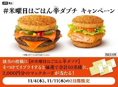 日本マクドナルド株式会社(本社:東京都新宿区、代表取締役社長兼CEO:日色 保)は、「ごはんバーガー」シリーズに新商品となる「ごはん辛ダブチ」を、夕方5時からの「夜マック」で、10月27日(水)より全国のマクドナルド店舗にて、期間限定で販売いたします。9月に新登場し大好評をいただいている「ごはん海老 旨辛仕立て」、「ごはんチキン にんにく黒胡椒」とあわせて、3種類の「ごはんバーガー」をお楽しみいただけます。(※「ごはんチキン にんにく黒胡椒」はご好評につき、一部店舗では販売を終了しております。)