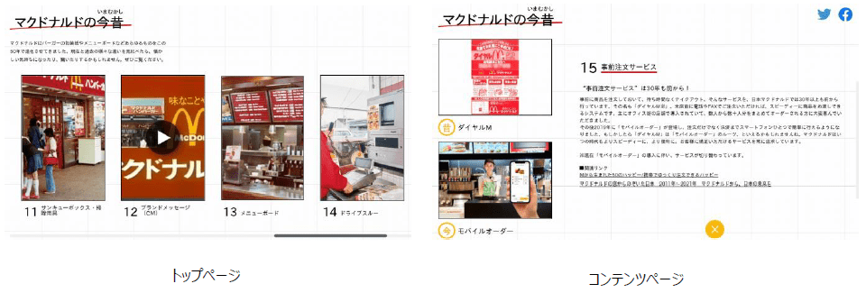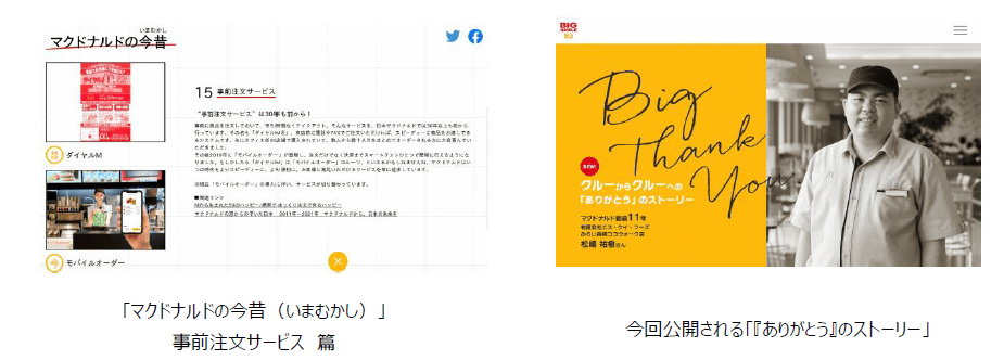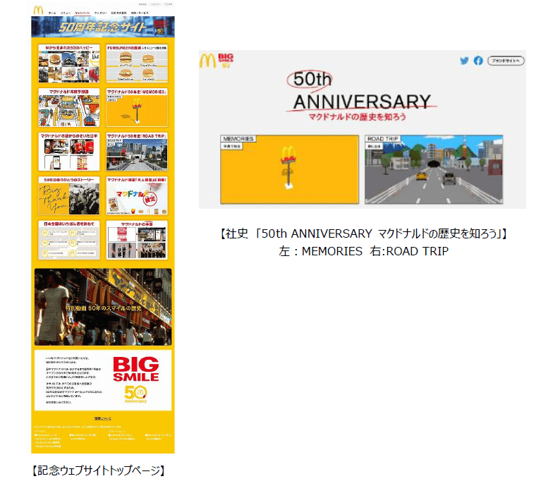2021年1月から、50周年を記念した特設ウェブサイトを公開しています。オープン時にはコンテンツ第一弾として「社史」を公開しました。年表「MEMORIES」にはマクドナルドクイズが隠れていたりと、FUNあふれるコンテンツとなっています。また、マクドナルドの歴史をゲーム感覚でドライブしながら楽しめる「ROAD TRIP」では、1971年から2021年まで各時代のゲームのような世界感だけでなく、実際のマクドナルドの店舗も再現されているなど、その時代の景色もお楽しみいただけます。次々出てくる建物や看板をタップやクリックすることで、日本マクドナルドの歴史の詳細を知ることができます。その他にもマクドナルドのこれまでの軌跡を「Mから生まれた50のハッピー」として紹介するコンテンツや、日本の社会とマクドナルドの歴史を照らし合わせた読み物コンテンツ、定番メニューのトリビアなども盛りだくさんです。また、4月からはコンテンツ第二弾として、「マクドナルド未来予想図」、7月には第三弾として、「日本全国のいちばん店を訪ねて」を追加公開しました。そして、今回は「マクドナルドの今昔(いまむかし)」と「Big Thank You」の新たな「ありがとうのストーリー」を公開しています。