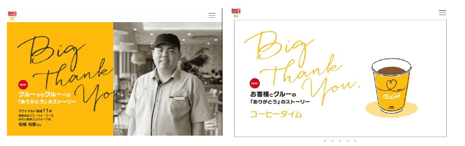 お客様に対してはもちろん、共に働くクルーやお取引先様に対しても、「ありがとう」を伝え合います。「Big Thank You」では、マクドナルドを支えてくださっている方々に、たくさんの「ありがとう—Big Thank You!」の思いを込め、お客様、お取引先様や地域の皆さま、永年勤続クルーの方など、マクドナルドで生まれた、様々な「ありがとうのストーリー」を毎月お届けしています。