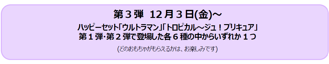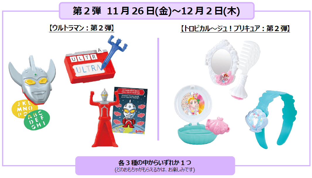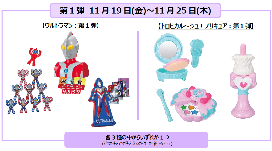 11⽉20⽇(⼟)・21⽇(⽇)の2⽇間は、ハッピーセット「ウルトラマン」を1セットご購⼊につき「ウルトラマン 5つのチャレンジシール」を、ハッピーセット「トロピカル~ジュ!プリキュア」を1セットご購⼊につき「トロピカル~ジュ!プリキュア チャレンジシール」をプレゼントいたします。