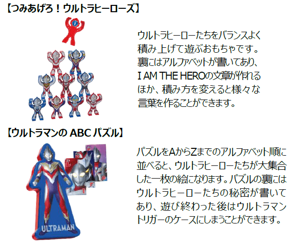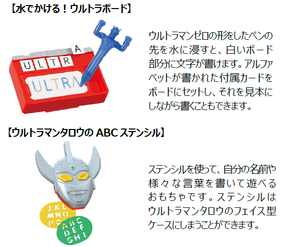 今年55周年を迎え、親子3世代にわたって人気を集めるウルトラマンが、ハッピーセットに登場します。今回のおもちゃは、言語、想像力、そして空間認識がテーマの全6種です。55年の歴史あるウルトラマンと一緒に、アルファベットや英単語に親しみ、英語のピースや言葉を見分けるゲームなどを通じて、遊びながら学べるおもちゃです。ウルトラマンのピースを積み上げる遊びは、図形を構成する力(空間認識)を育みます。そのほか、アルファベットが書かれたカードを使って英単語を作るスピードを競うゲーム「ウルトラマンのワードゲーム」や、ペン先を水に浸し、ボードにABCを書いて遊べる「水でかける!ウルトラボード」など、オリジナリティ溢れる仕掛けのおもちゃが揃います。親子3世代にわたって愛されるウルトラマンとともに、ウルトラヒーローたちの物語への想像を広げながら、アルファベットで楽しく遊んでいただけます。