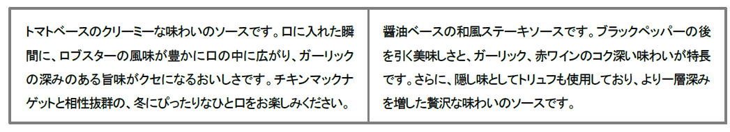 「ロブスター&トマトクリームソース」は、トマトベースのクリーミーな味わいで、口の中に広がるロブスターの風味、そして深みのあるガーリックの旨味がクセになる冬にぴったりのソースです。「コク旨ステーキソース」は、ブラックペッパーやガーリック、赤ワインのコク深い味わいが特長の醤油をベースとした和風ステーキソースで、隠し味としてトリュフを使用しており、どちらもシェアいただくのにぴったりなソースです。