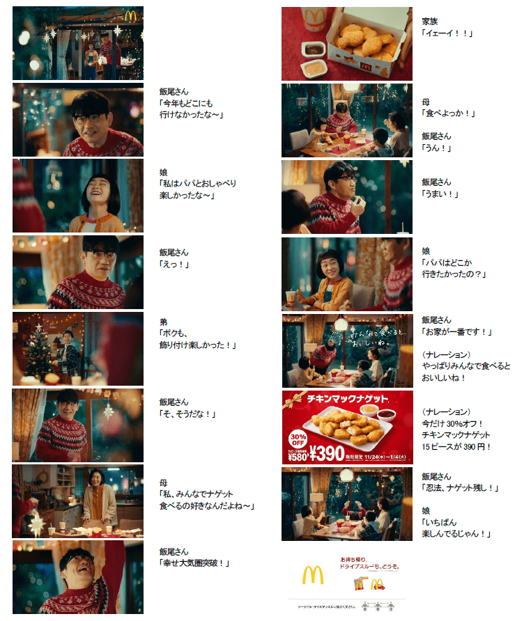 新TVCMにはお笑いコンビ「ずん」の飯尾和樹さんが登場し、家族揃っての食卓を笑いで包む、とっておきのギャクを披露します。心から楽しみ切れなかった1年を振り返りながらも、笑顔の家族と一緒に温かいチキンマックナゲットを頬張り、「みんなで食べると、おいしいね。」というメッセージに込められた世界観を、ほっこりと心が和む映像でお伝えします。また、12月1日(水)から24日間連続で、毎日プレゼントが当たる・もらえる「アドベント・チキンマックナゲット」Twitterキャンペーンも開催いたします。(詳細は下記を参照)