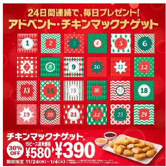 期間中、マクドナルド公式Twitterアカウント(@McDonaldsJapan)をフォローし、毎日投稿される「#アドベントチキンマックナゲット」でお楽しみいただけます。