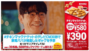 12月1日(水)からクリスマスイブ当日までの24日間、日数を数えるために使用されるカレンダーをイメージして、今回、マクドナルドでは「アドベント・チキンマックナゲット」と題して、12月1日(水)から24日間連続で毎日ワクワクするようなプレゼントが当たる・もらえるTwitterキャンペーンを開催します。飯尾さんのサイン入マックカードなど貴重なプレゼントも抽選で当たるチャンスがあります。