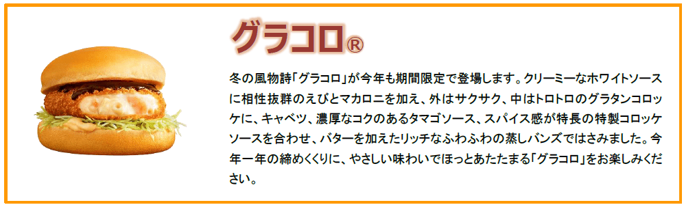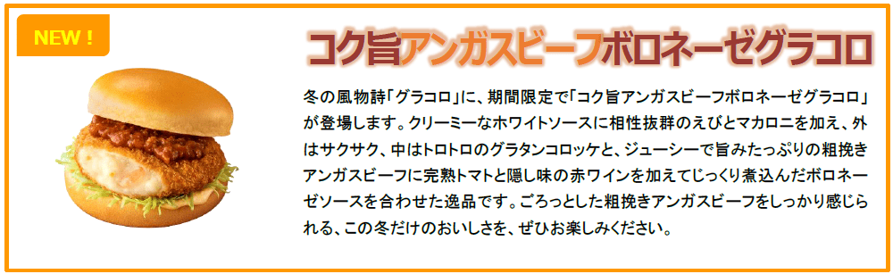 「グラコロ」は、クリーミーなホワイトソースに相性抜群のえびとマカロニを加え、外はサクサク、中はトロトロのグラタンコロッケに、キャベツや濃厚でコクのあるタマゴソース、そしてスパイス感が特長の特製コロッケソースを合わせ、バターを加えたリッチなふわふわの蒸しバンズではさんだ、一年の締めくくりにほっとあたたまることができるやさしい味わいのバーガーです。新商品の「コク旨アンガスビーフボロネーゼグラコロ」は、グラタンコロッケに、ジューシーで旨みたっぷりのごろっとした粗挽きアンガスビーフに完熟トマトと隠し味の赤ワインを加えてじっくり煮込んだ、グラコロ史上初となるボロネーゼソースを合わせた、コク旨な一品です。寒い冬にぴったりな、温かいおいしさを、ぜひお楽しみください。