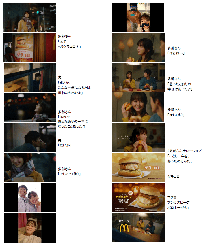 「ことし一年を、あっためるんだ。」をテーマとした「グラコロ」の新TVCMには多部未華子さんが出演します。年末に忙しく過ごす中で「え、もうグラコロ?」と季節の移り変わりを「グラコロ」の登場で感じ、優しい夫とともに「グラコロ」を通して一年を振り返る、温かで情緒のある、ほっこりとした夫婦のやり取りを披露します。「グラコログラコロ♪」のフレーズでお馴染みの“グラコロソング”も、今年は多部さんが担当。寒い冬に心が温まる、グラコロの世界観を表現したストーリーにご期待ください。