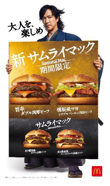 2022年初の新商品として登場する「旨辛 ダブル肉厚ビーフ」は、熟成させた唐辛子ソースとスパイシーチーズの辛さに、2枚重ねた肉厚ビーフのボリュームがやみつきになる、見た目も新しい“赤いサムライマック”です。また、「燻製(くんせい)風マヨ トリプルベーコン肉厚ビーフ」は、思わずクセになる香ばしい燻製(くんせい)風マヨソースの味わいに、3枚のスモークベーコンを重ねた、肉厚ビーフのボリュームがやみつきになる一品です。“大人が満足する”というコンセプトをそのままに、さらなる個性を引き出した、ボリューミーかつ味わい深さを楽しめる期間限定の『サムライマック』をぜひご堪能ください。