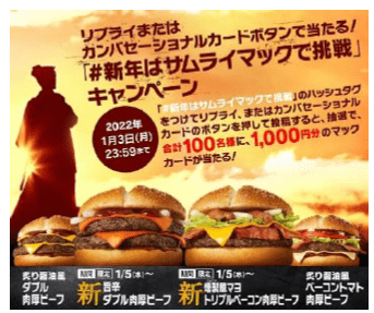 日本マクドナルド株式会社(本社:東京都新宿区、代表取締役社長兼CEO:日色 保)は、『サムライマック』と銘打った肉厚ビーフのレギュラーバーガー「炙り醤油風 ダブル肉厚ビーフ」「炙り醤油風 ベーコントマト肉厚ビーフ」が大変ご好評いただいていることを受け、期間限定の新商品として「旨辛 ダブル肉厚ビーフ」と「燻製(くんせい)風マヨ トリプルベーコン肉厚ビーフ」を2022年1月5日(水)から全国のマクドナルド店舗にて販売します。