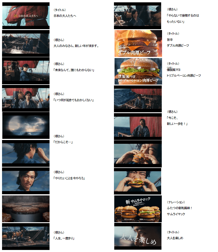 「さぁ、大人を楽しもう」のフレーズでご好評をいただいている、俳優の堺雅人さんが出演する『サムライマック』のTVCMシリーズでは、「新年を迎えるサムライたちへ」篇を12月27日(月)からオンエアします。今回は“サムライ”に扮した堺さんが、荒波を乗り越えながら大海原を旅する志士と共に嵐に立ち向かう勇ましい姿を描きました。また、Twitterキャンペーンを1月1日(土)より順次実施しますので、あわせてお楽しみください(詳細は下記に掲載しています)。