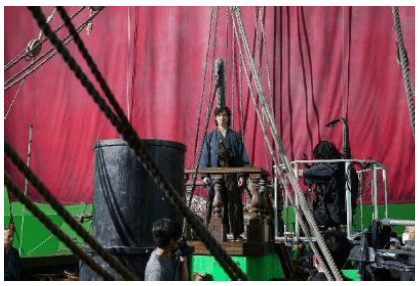 撮影当日、スタジオには全長20mを超える巨大な船が用意されました。かつて実在した蒸気帆船「咸臨丸」をイメージして設計された美術セットは、真紅の帆を張る2本のマスト(帆柱)に極太の縄を這わせ、そのまま航行できそうなほどリアルな造形。スタジオ入りした堺さんはマストを見上げながら予想外のスケールに驚きの表情を見せつつも、冷静な足取りで後方から“乗船”しました。