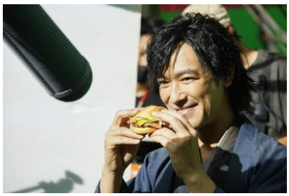 「燻製(くんせい)風マヨ トリプルベーコン肉厚ビーフ」を食べるシーンに臨んだ堺さんは、「残り数カットでもキレイに見せたい」と、セットチェンジの待機時間を利用して食べ方を熱心に練習しました。肉厚ビーフと共に重ねられたレタスやチーズ、3枚のベーコンをしっかり見せながら崩さず頬張る動作はとても繊細で堺さんも苦戦気味でしたが、絶妙の力加減でOKが出ると、「これでダメならパントマイムでやるから合成してね」とお茶目な表情を見せました。